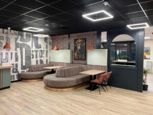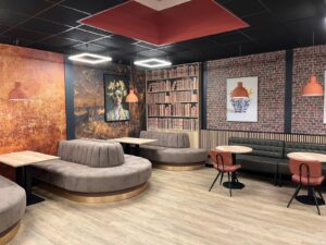 Deze ruimte is nu eigenlijk te mooi om hem ‘kantine’ of ‘leerlingenruimte’ te noemen. Het is een fijn café, om te praten, eten, drinken, zitten, enzovoorts. Een (meteen al populair) leerlingencafé.